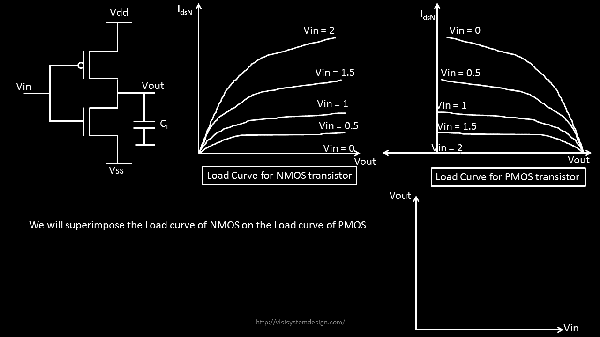 Step 4: Now, if you carefully look into the super-imposed curve and pick up the first intersection point of Vin(PMOS) and Vin(NMOS), you will find that at Vin = 0V, the Vout = 2V and …. (sentence continued after below image)