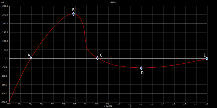 Static Current Noise Margin (SINM) – It is the maximum tolerable dc noise current injected at internal nodes of the bitcell before its content changes and it is denoted by point B. SINM = 255.67uA