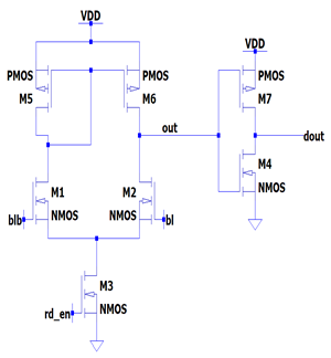 A sense amplifier senses a small voltage difference at its inputs BL & BLB and amplifies it to a recognizable logic ‘0’ or ‘1’ voltage level at the output terminal dout. With the help of the sense amplifier, the data read operation is performed at a faster rate thereby increasing the access time.