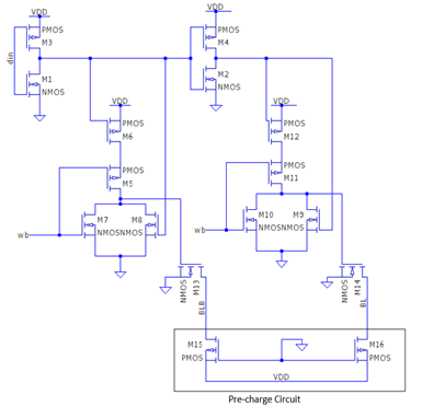The above figure shows the data write circuitry for sram. Whenever wb goes low, the input data is written to the bitlines BL & BLB. The precharge circuit keeps the bitlines to Vdd when no read or write operation is performed. If din=0 (or 1) then the bitline BL (or BLB) discharges through the nmos transistor.