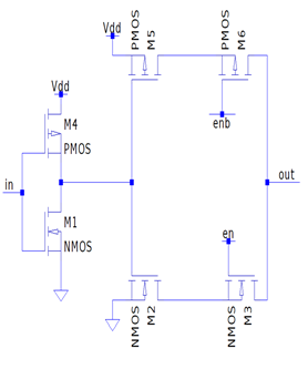 A tristate buffer allows multiple logic blocks to be connected to the same line without damage or loss of data. The above tristate buffer uses a differential enable signal. Whenever enable signal is present the input data is present at the output otherwise output remains in high impedance state.