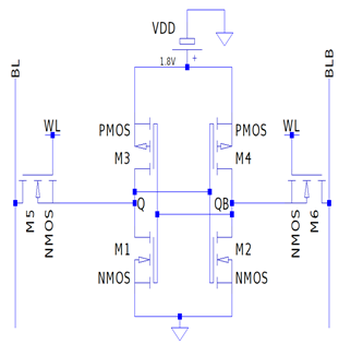 It uses bistable cross-connected inverters (M1, M3 & M2, M4) as a latching circuit. Based on the state of the latch circuit the data is interpreted as logic ‘1’ or ‘0’. The access switches M5 & M6