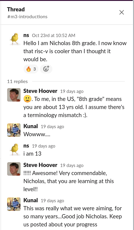 One of my great pleasures operating my EDA startup, Redwood EDA, is working with enthusiastic college students and open-source developers and seeing how our technology is renewing excitement for logic design. Recently, Kunal Ghosh of VLSI System Design and I conducted our third “Microprocessor for You in Thirty Hours” (MYTH) Workshop, where participants learn about RISC-V and build their own RISC-V CPU cores (something that’s typically done over the course of a semester or two). In addition to reaching graduate students and professionals, one of our goals with the workshop is to give students an opportunity to learn logic design earlier in their education–like, say, as a college freshman or sophomore. So just imagine our surprise when Nicholas introduced himself in the chat forum of our workshop.
