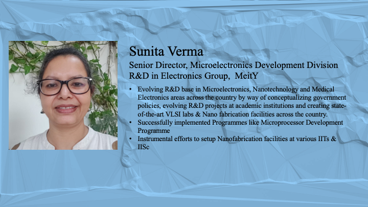 12:45-13:15 | Talk by Govt. of India | Government Initiatives in ESDM Space | Sunita Verma | Meity, Govt. Of India |