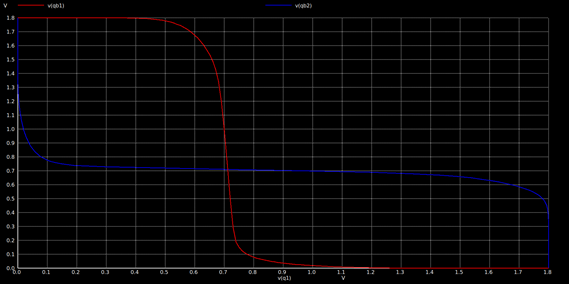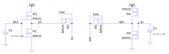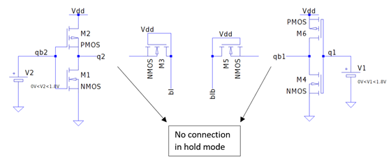 Hold SNM: In hold SNM analysis, the inverters are separately analyzed and the access transistors are disconnected from the inverters as shown above. SNM curve (butterfly curve) is obtained by plotting VTC of one inverter with the inverse VTC of another inverter as shown below.