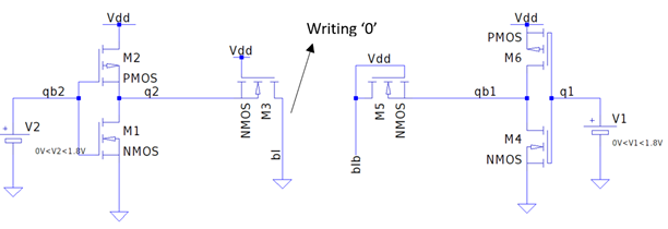 Write Operation: Whenever the word line is activated, the data present at the bitlines BL & BLB is written at the internal nodes Q & QB respectively.