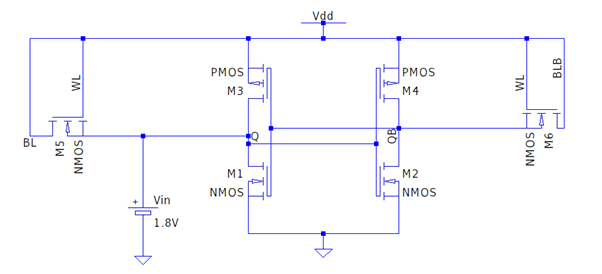 It uses bistable cross-connected inverters (M1, M3 & M2, M4) as a latching circuit. Based on the state of the latch circuit the data is interpreted as logic ‘1’ or ‘0’. The access switches M5 & M6
