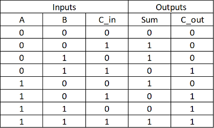 This circuit takes two input bits along with the carry bit from the previous stage of the adder(if it’s the first stage maybe we can take C_in as 0). The circuit performs the addition of two bits along with carrying and results in sum and carry out bits as per the truth table given below.