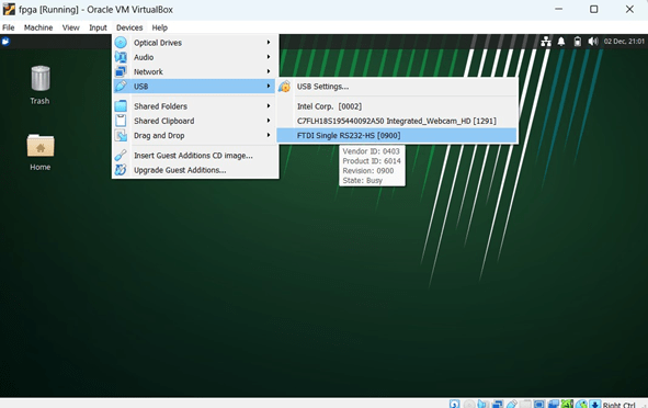 – On the Virtual Machine, click on ”Devices → USB → FTDI Single RS232-HS [J900]” as