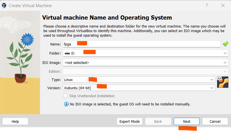 - In the ”Create Virtual Machine” wizard, enter a name for the virtual machine and select the operating system type as Linux and version as Xubuntu (64-bit) that matches the one installed in the VDI file you want to open. And then click on ”Next”