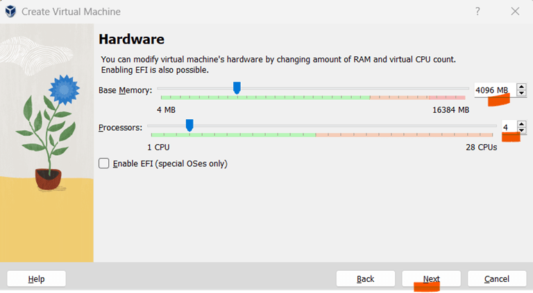 - On the next screen, allocate memory as 4GB (or 4096 MB) and number of CPUs as 4, as shown in Fig 6. Then click on ”Next” button