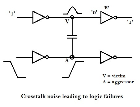 In deep sub-micron technology (i.e. <130nm) and below, the lateral capacitance between nets/wires on silicon, becomes much more dominant than the inter layer capacitance. Hence, there is a capacitive coupling between the nets, that can lead to logic failures and degradation of timing in VLSI circuits. Crosstalk is a phenomenon, by which a logic transmitted in vlsi circuit or a net/wire creates undesired effect on the neighboring circuit or nets/wires, due to capacitive coupling.