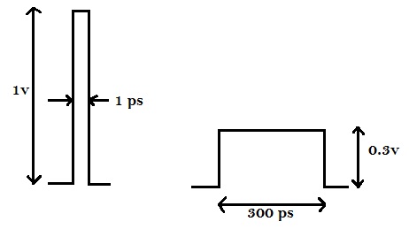 Consider a case, where the pulse height Vp is high (1V), with small pulse width (e.g. 1ps) as opposed to another scenario, where the pulse height is low (e.g. 0.3V) and pulse width is large (e.g. 100ps). This can be illustrated in the diagram below.