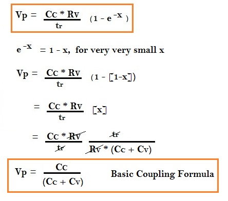If x is very very small i.e. Rv(CC + CV) is large compared to tr, then e-x ~ (1 – X)