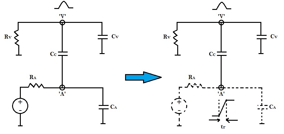 ‘Victim’ and ‘aggressors’ drivers can be modeled by resistors ‘RV‘ and ‘RA‘, respectively. Whereas ‘victim’ and ‘aggressors’ loads can be modeled by capacitors ‘CV‘ and ‘CA‘, respectively. Let the coupling capacitance between them be CC. The above model can be further simplified as shown in figure below.