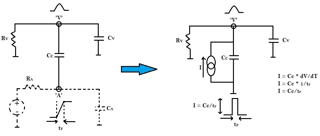 Essentially, the above figure represents a voltage source connected at aggressor node ‘A’ with a series capacitance ‘CC‘. By Thevinin to Norton conversion, this voltage source can be replaced by a current source with parallel capacitance ‘CC‘ as shown below: