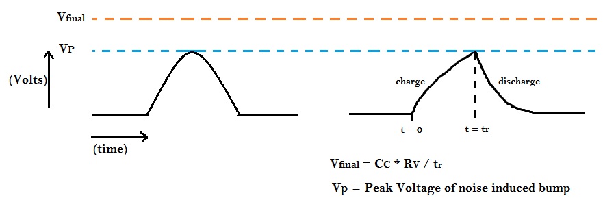 The noise induced bump is nothing but charging-discharging waveform across capacitor as shown below: