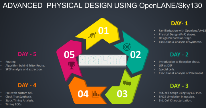 Know what Pentagon is? It is a plane figure which has 5-straight sides and 5-angles. For a perfect pentagon, it needs all its sides and angles to be the same, till the last decimal. Do you know what is the similarity between pentagon and our upcoming workshop “Advanced Physical Design workshop using OpenLANE/SKY130”? Look above image and you would guess it right. It is a perfect blend of topics where even a fresher can jump-start his/her career in chip design in just 5-days