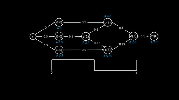 In the above image, a(2) says cell ‘a’ has a delay of 2 units, wire delay from (say) i2 to input of cell ‘a’ is 0.1 units and i2(0.3) represents the time (after launch clock edge) when signal transition occurs. In this case, signal transition occurs at 0.3 time units after launch clock edge.