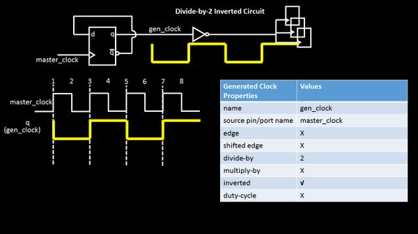 - Just use the options divide-by 2 and ‘inverted’, while put an ‘X’ for other ones, where ‘X’ means, say, ‘not needed’ This completes the definition of inverted, divide-by-2 gen clock OR….(sentence completed after below image)