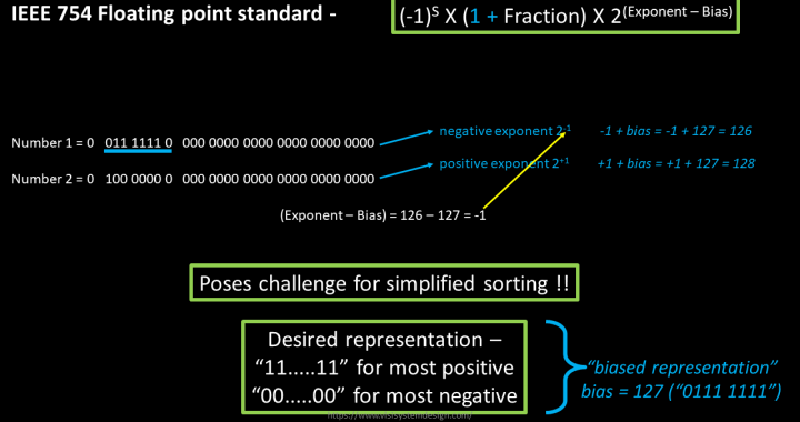 A number with 2-1 exponent should look smaller than a number with 2+1 exponent. But that was not the case with existing IEEE format. The desired representation would be all ‘1’s for most positive number and all ‘0’s for most negative number, like 0111 1111 for most positive (since exponent field is 8bits, with highest bit reserved as “sign bit”) and 0000 0000 for most negative.