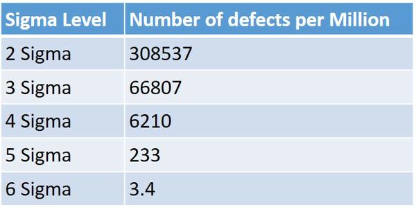 Below table will help understand sigma level and what it means in terms of “number of defects”