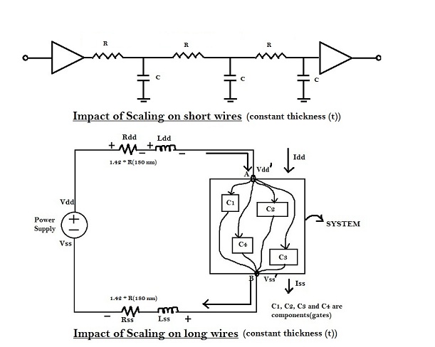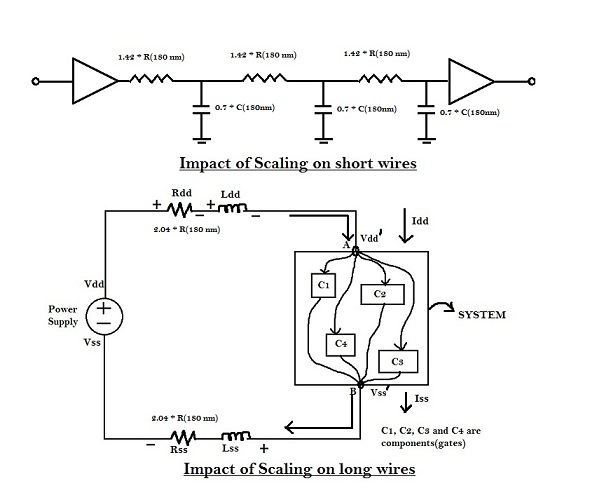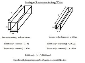 But, for long wires, ‘R’ scales up by (1/s2), whereas the capacitance remains the same. Hence, the RC delay for long wires increases by (1/s2). If s = 0.7, then RC delay increases by 2.04. If long wires are used for power rails, it would affect the noise margin of the circuit. Also, if long wires are placed between two logic cells, the RC delay between the cells will increase significantly, which may lead to potential setup violation.