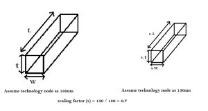 The dimensions of interconnects (wires) scales down, as VLSI technology scales down by a factor called as ‘scaling factor (s)’. The scaling factor is an integer by which the dimensions of interconnects shrinks down. Typically, the resistance, capacitance and inductance are the 3 main factors of wires that is affected by scaling. Following sections will explain how each factor gets affected by scaling, and concurrently, its impact on system.