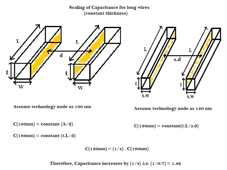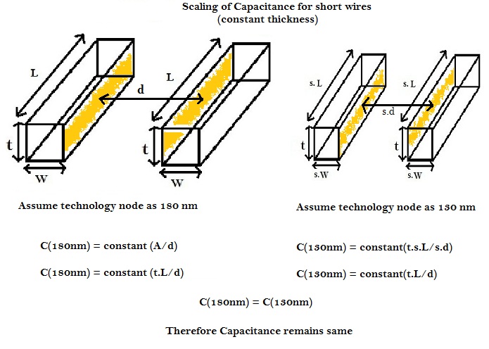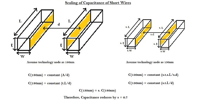 In case of short wires, all the parameters of wire scale down. Hence the capacitance goes down by the scaling factor i.e. 0.7, as per equations shown in above diagram.