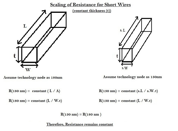 For short wires, ‘R’ scales by (1/s), whereas ‘C’ scales by (s). Hence, the RC delay for short wires is unaltered, which means that the capability of short wire to transmit high frequency signals,is same.