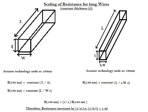 On the other hand, for long wires, where the length of wire is independent of scaling, only thickness and width of the wire scales down. Hence, as per above equations, the resistance of long wire increases considerably by 2.04.
