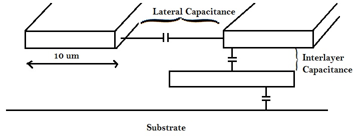 In the above 5um technology, the dominant capacitance, was the parallel plate capacitance between adjacent layers, i.e. inter layer capacitance. The lateral coupling capacitance’s i.e. capacitance between two conductors on the same plane, exists, but ineffective.