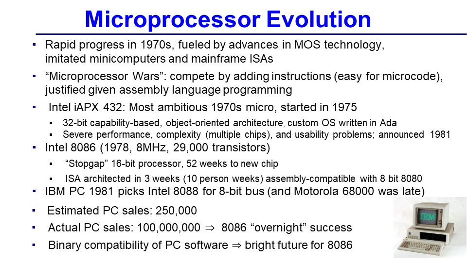 Now the microprocessor people at that time really didn’t understand computer architecture, so what they did is basically imitated minicomputers and mainframes. The way they would integrate (because people were programming in assembly language) is they would add new instructions which was easy to do in micro-code. They would add some special instructions and write it in assembly language. Example, one was better, and another company would do another one.