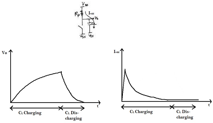 Consider the following scenario where output capacitor CL charge from 0 to 'Vdd' as input switches from 'Vdd' to '0':