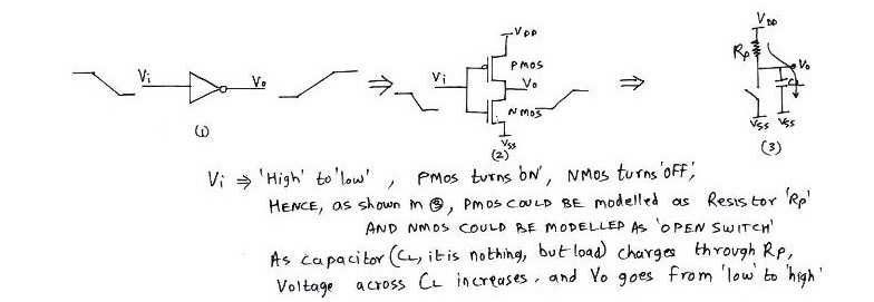 We understand that when 'Vi' switches from low to high (or high to low), 'Vo' switches from high to low (or low to high). But, 'Vo' doesnt changes instantaneously, but after a finite amount of delay after application of 'Vi'. The time required for change in 'Vo' after application of 'Vi', is called as propagation delay of the inverter. This would be more clear in the next section.