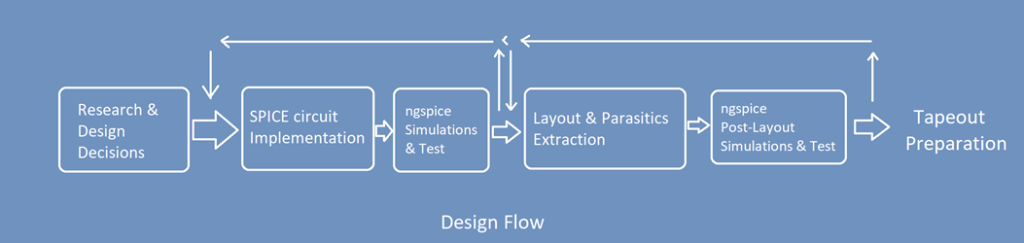 The regular design flow was followed. The circuit implementation to start off with, followed by the corresponding ngspice simulations and corrections to circuits. It was a tough challenge to implement a PLL circuit but at the same time an effective learning process. Then comes the backend – layout design followed by parasitic extraction (also available in Magic). Through this flow the regular loop back for corrections was required. Infact, going into post-layout simulations it was almost immediately clear that quite a bit of corrections in circuit and layout was needed and had to regress back and repeat the process until the result could meet the specifications. Initial specification was to achieve expected functionality (proper locking, good lock-time and low jitter) for a range of temperature for different corners. Taking up the whole design process it was seen more feasible in the available time to focus on just the ‘tt’ corner at room temperature.