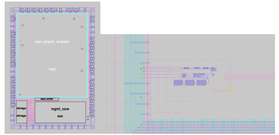 On the right: Zoomed in on the PLL inside the Caravel, the thick horizontal and vertical rails are the power lines. There are also input and output pins along this periphery and the PLL inputs and outputs are connected to the appropriate ones from it.