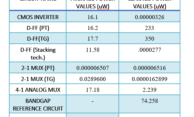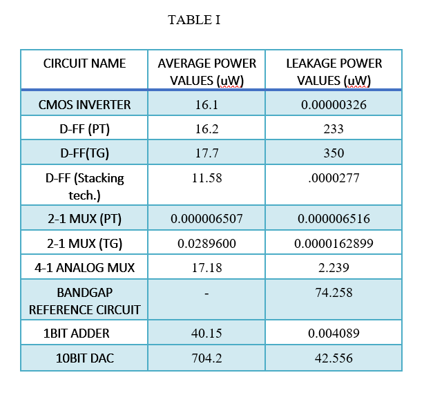 For the analysis of my power analysis tool I Simulate D flip flop using pass transistor, transmission gate, pass transistor with stacking of transistor as shown in “Fig 6-8”. 2-1 MUX using pass transistor, transmission gate, as shown in figure 9-10. Along with these circuits I also analyse the power of 4 input analog multiplexer circuit, band gap reference circuit, 1bit adder circuit, 2 bit analog to digital converter and 10 bit analog to digital converter circuit. Takes netlist and calculate average and leakage power values of circuits from tool presented in this paper. All obtained values from tool are tabulated in table 1.