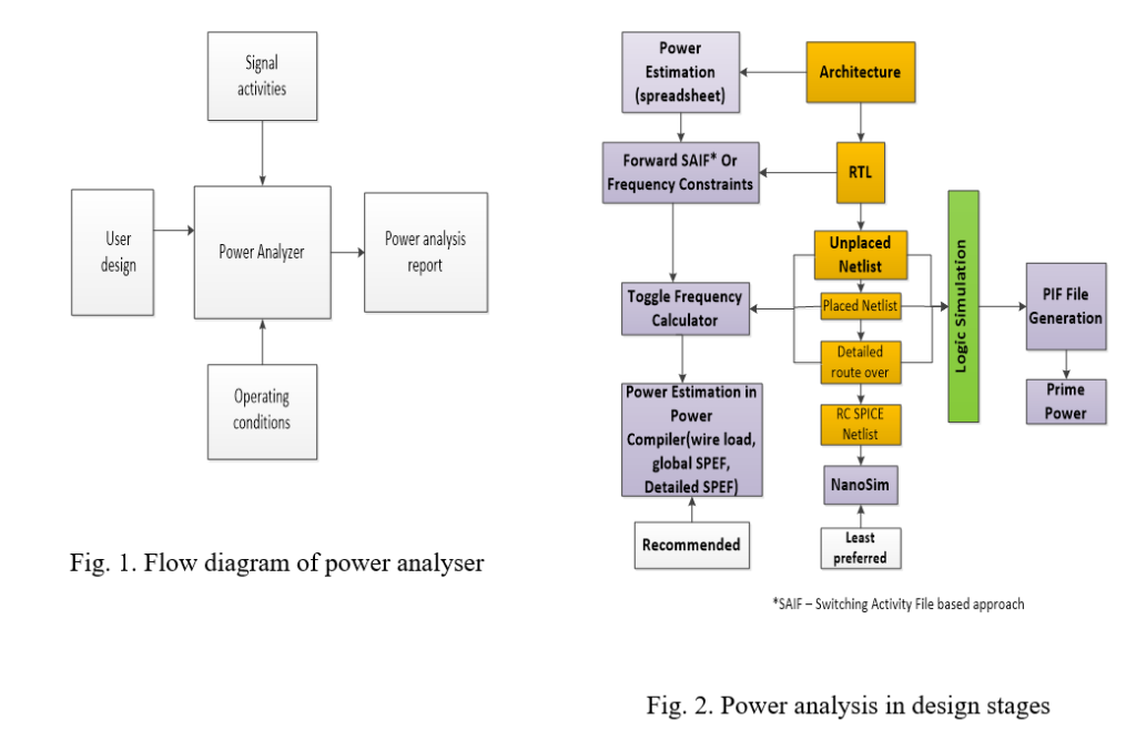 Power analysis of design can be reconnoitred at several levels such as system level, architectural level, logic level, circuit level and device level. Power analyser is a tool which determines how much power is utilize by a system or circuit. On the basis of study, design cycle of a typical power analysis in different stages is as shown in “Fig. 2”.