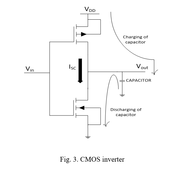 During switching there is some small time when both PMOS and NMOS are ON and there is short circuit current flow from VDD to ground as there exist a path between them as shown in “Fig. 3”. This power dissipation arises because practically input voltage pulse has some finite rise and fall time.