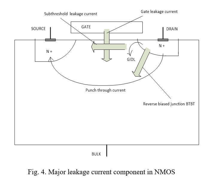 When gate voltage is less than threshold voltage of MOSFET then even a current flow from drain to source through channel because of drain voltage (VDS) this current is called as Subthreshold Leakage Current as shown in “Fig. 4”. It causes dissipation of power known as subthreshold leakage power dissipation.
