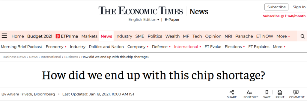 Above article does talk about chip shortage, which is due to increased demand of consumer electronics like laptops, tablets, mobiles, which was never the case few years back. Foundries in past were meeting these demands and are currently running at full capacity. But this new surge of electronics has created new opportunities and demand for new manufacturing facilities, optimistically, within each geographic region and that too, very soon