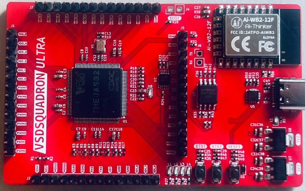 The VSDSquadron Ultra development board proudly showcases India’s indigenous semiconductor innovation using THEJAS32 SoC, powered by VEGA ET1031 from C-DAC’s VEGA Processor family at its core. Designed and built in India by VLSI System Design (VSD), the VSDSquadron Ultra integrates advanced RISC-V technology operating at 100 MHz with reliable Wi-Fi and Bluetooth 5 connectivity. It aims to support India’s booming electronics and IoT industries by providing accessible, robust, and cost-effective hardware solutions for innovators, students, and startups across the nation.