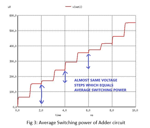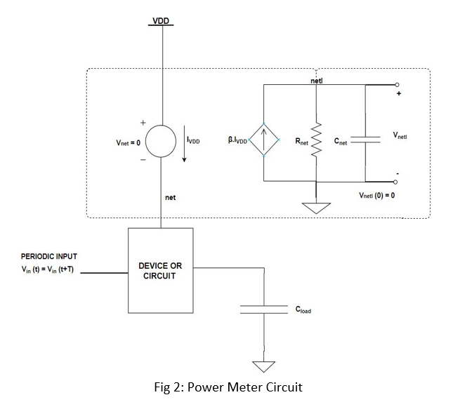 As shown in fig3, the measured step difference in voltage across power meter over a constant time period (here 2ns) is equivalent to the average switching power. For this a new netlist is written by modifying the user given netlist.