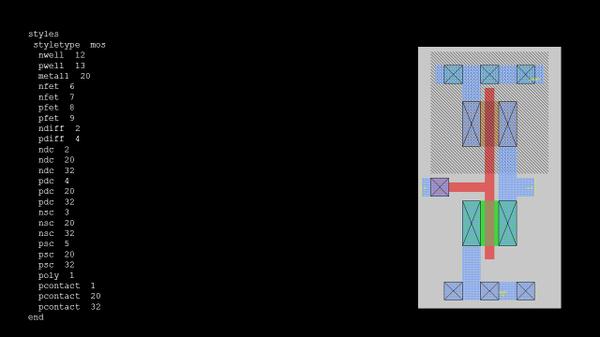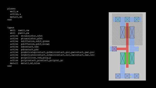 We will have the “planes” section first to define ‘planes’ ‘names’ such as ‘active’ plane to define the active region where transistor is being placed, ‘well’ plane to define the nwell or pwell where we would build the transistors, and ‘metal1’ plane to define metal layer plane for power/ground lines