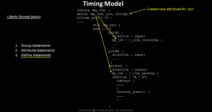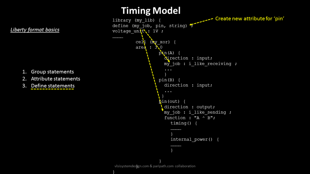 Liberty modeling format is mainly a syntactical collection of below statements: